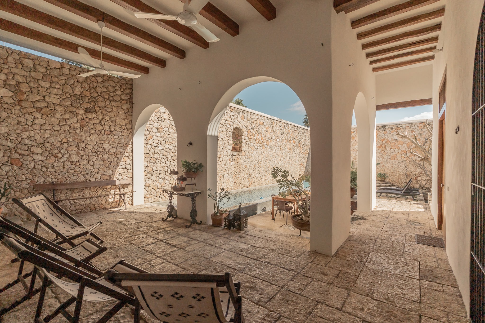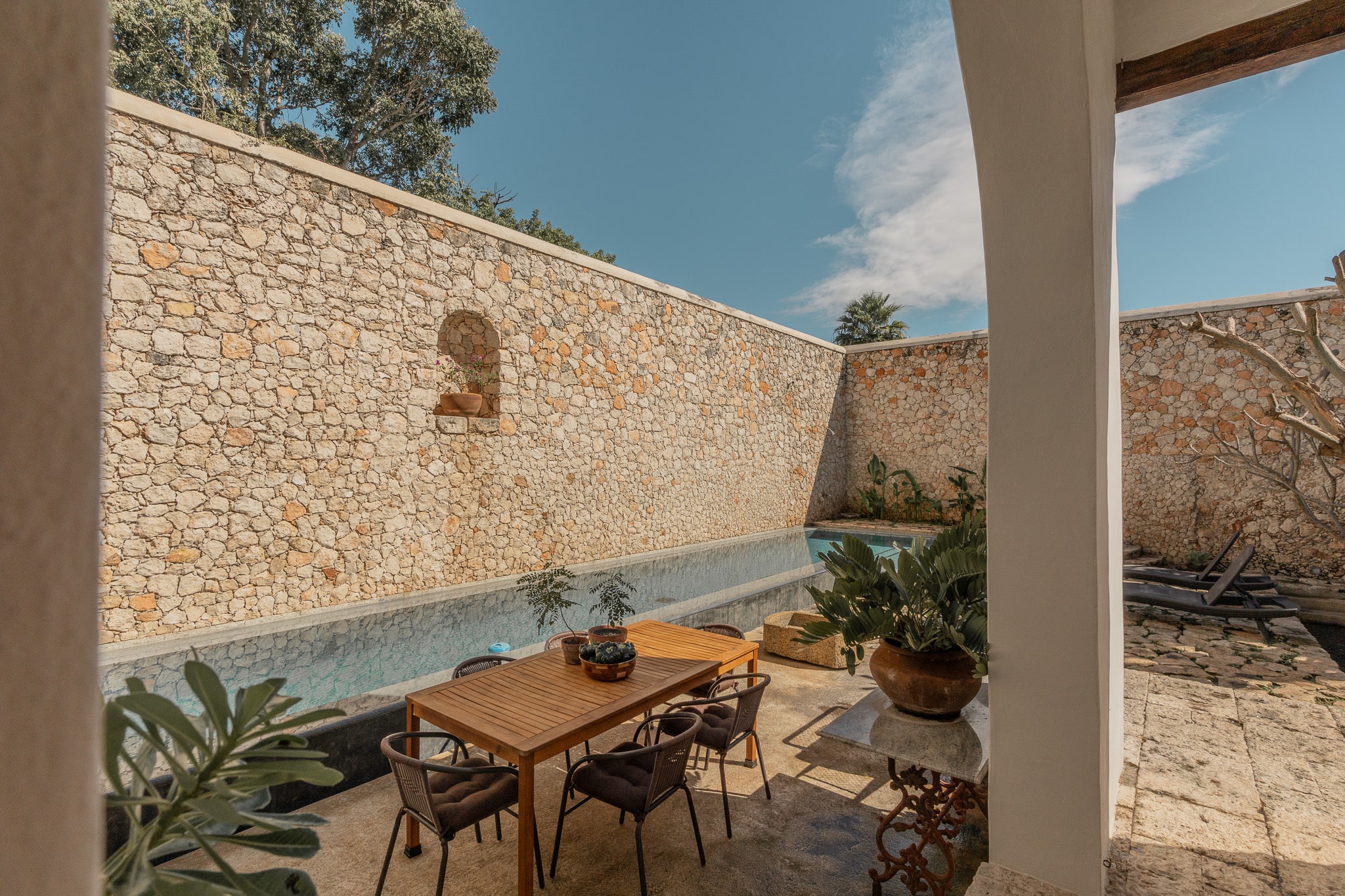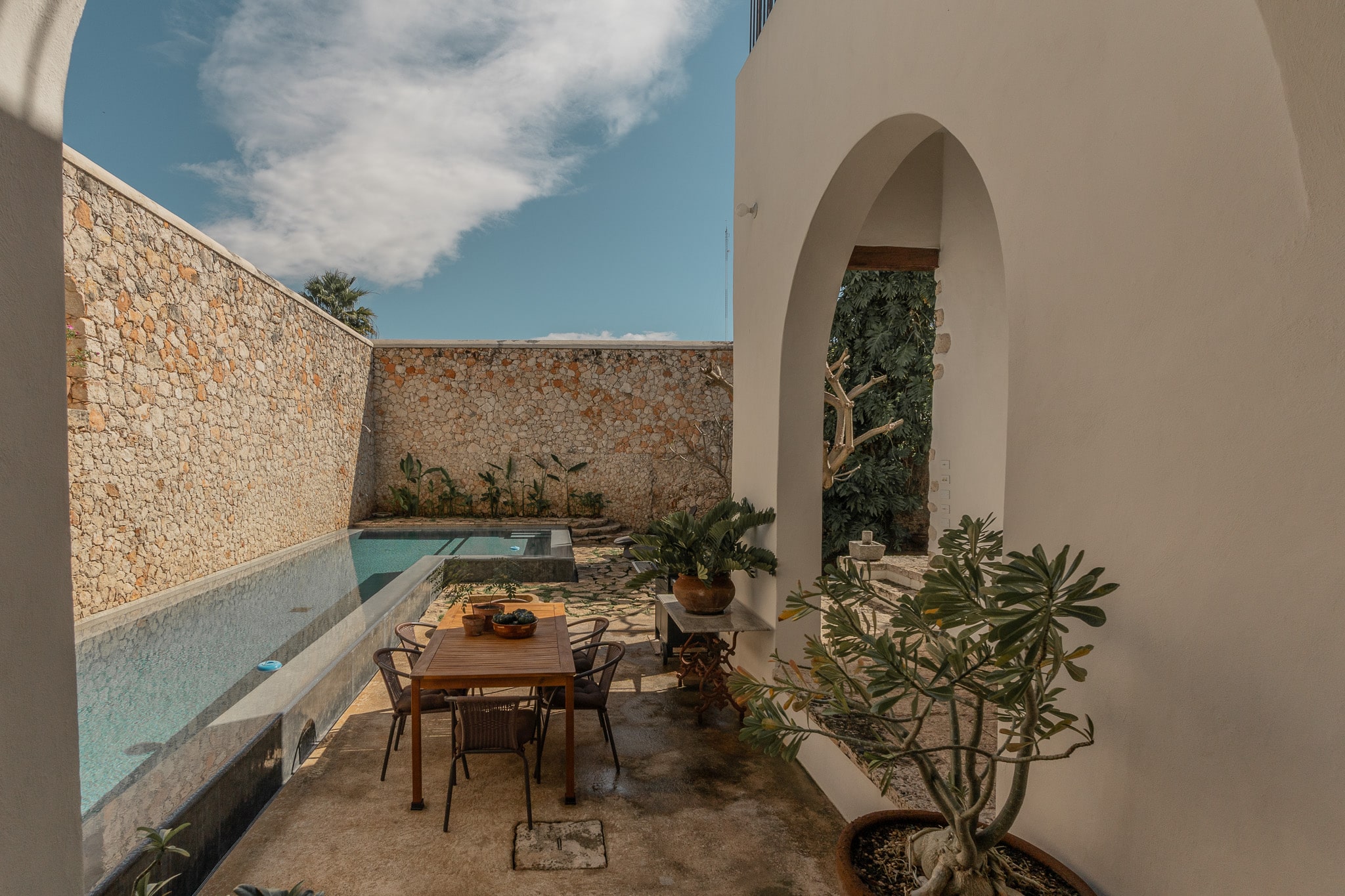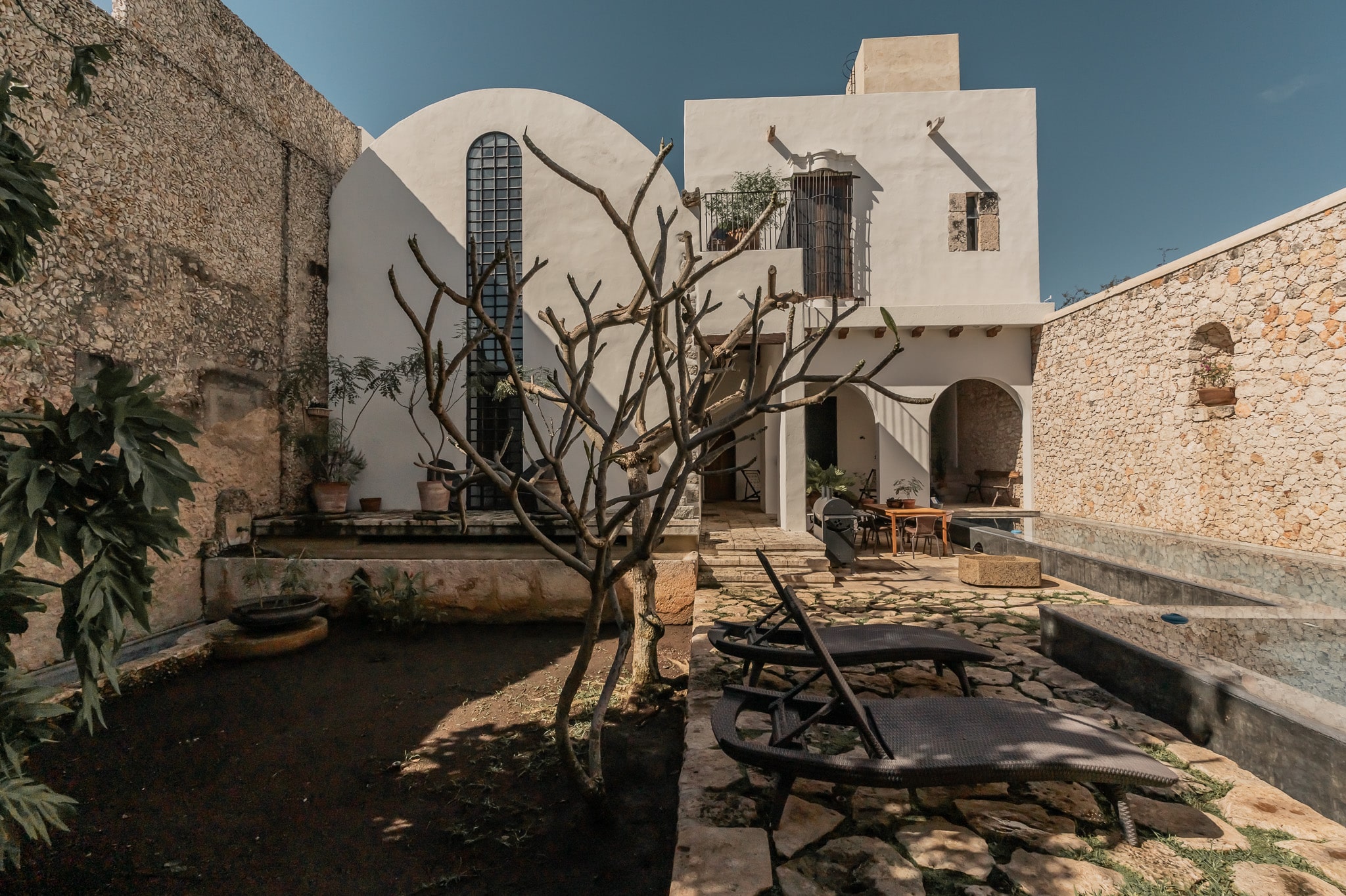 Con una superficie construida de 525m2 y 536m2 de terreno, esta exclusiva casa colonial de estilo mediterráneo cuenta con distintos niveles, con varias terrazas, amplio jardín que reúne grandes árboles y plantas tropicales, incluyendo tres especies de lirios acuáticos que florecen en un antiguo bebedero de una hacienda henequenera de la zona y una amplia alberca con un pequeño canal de nado.
